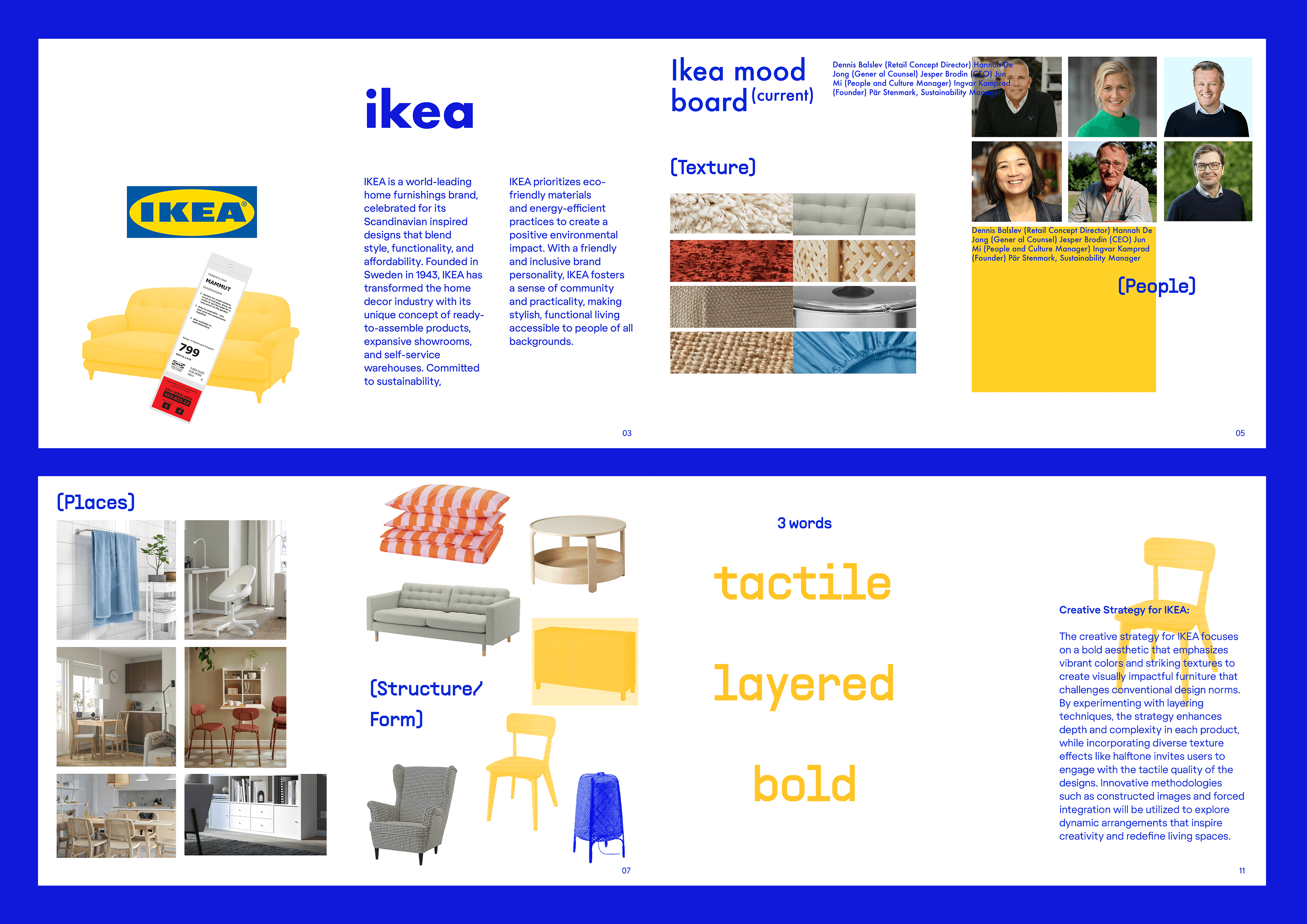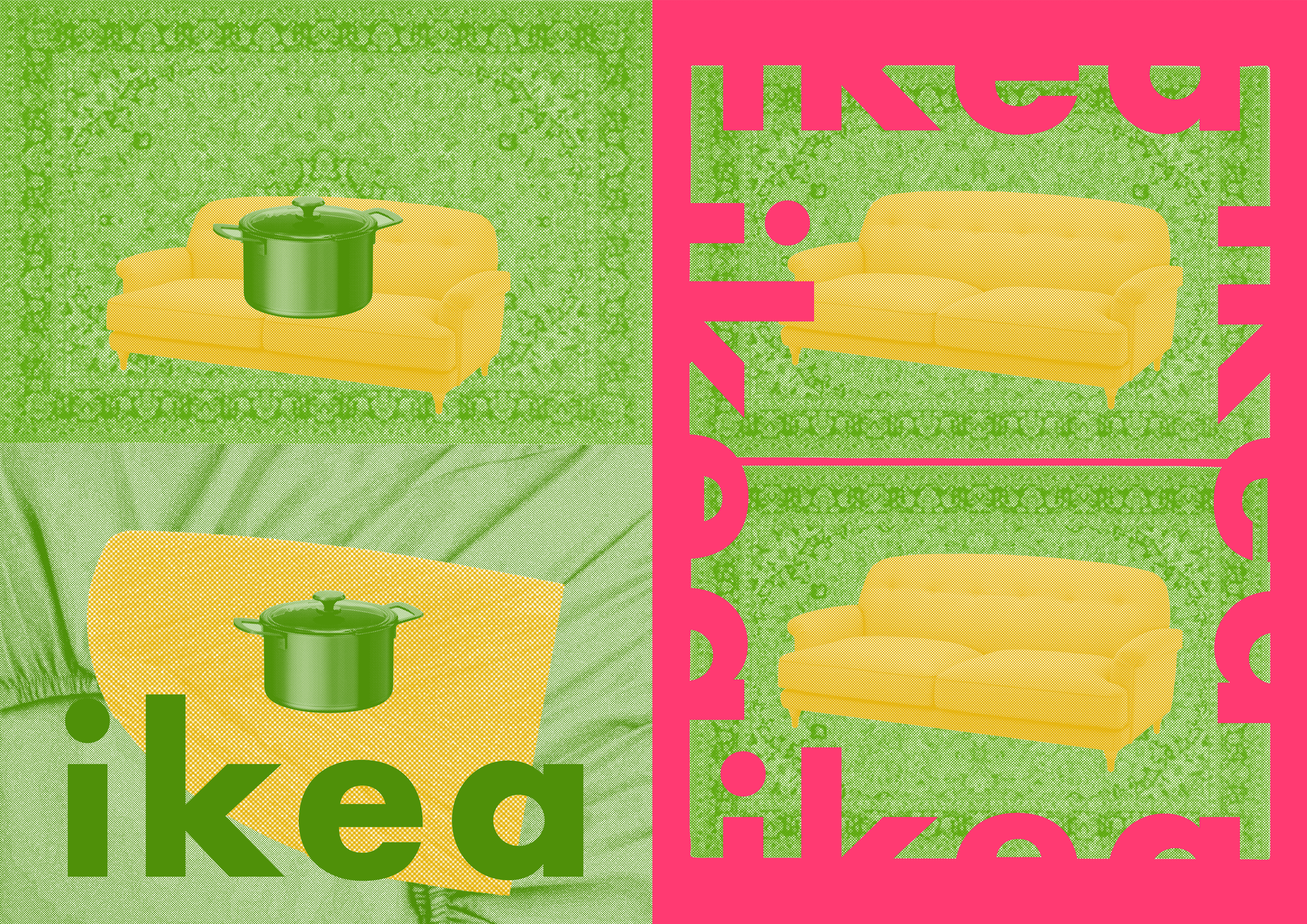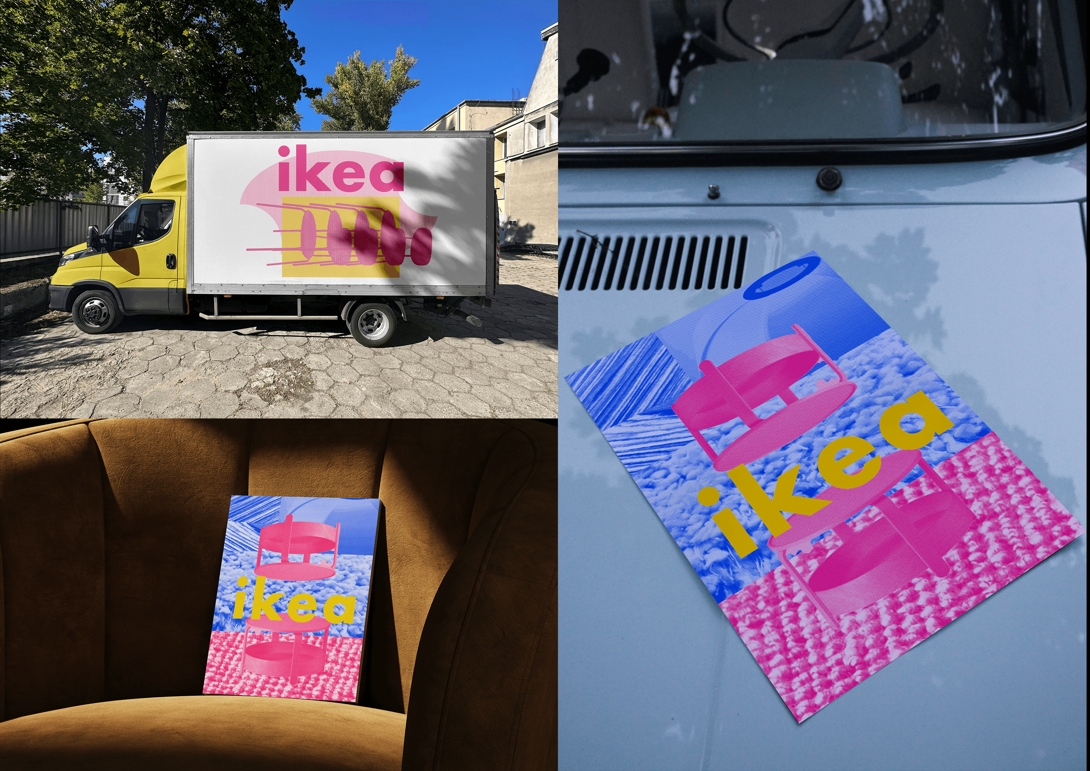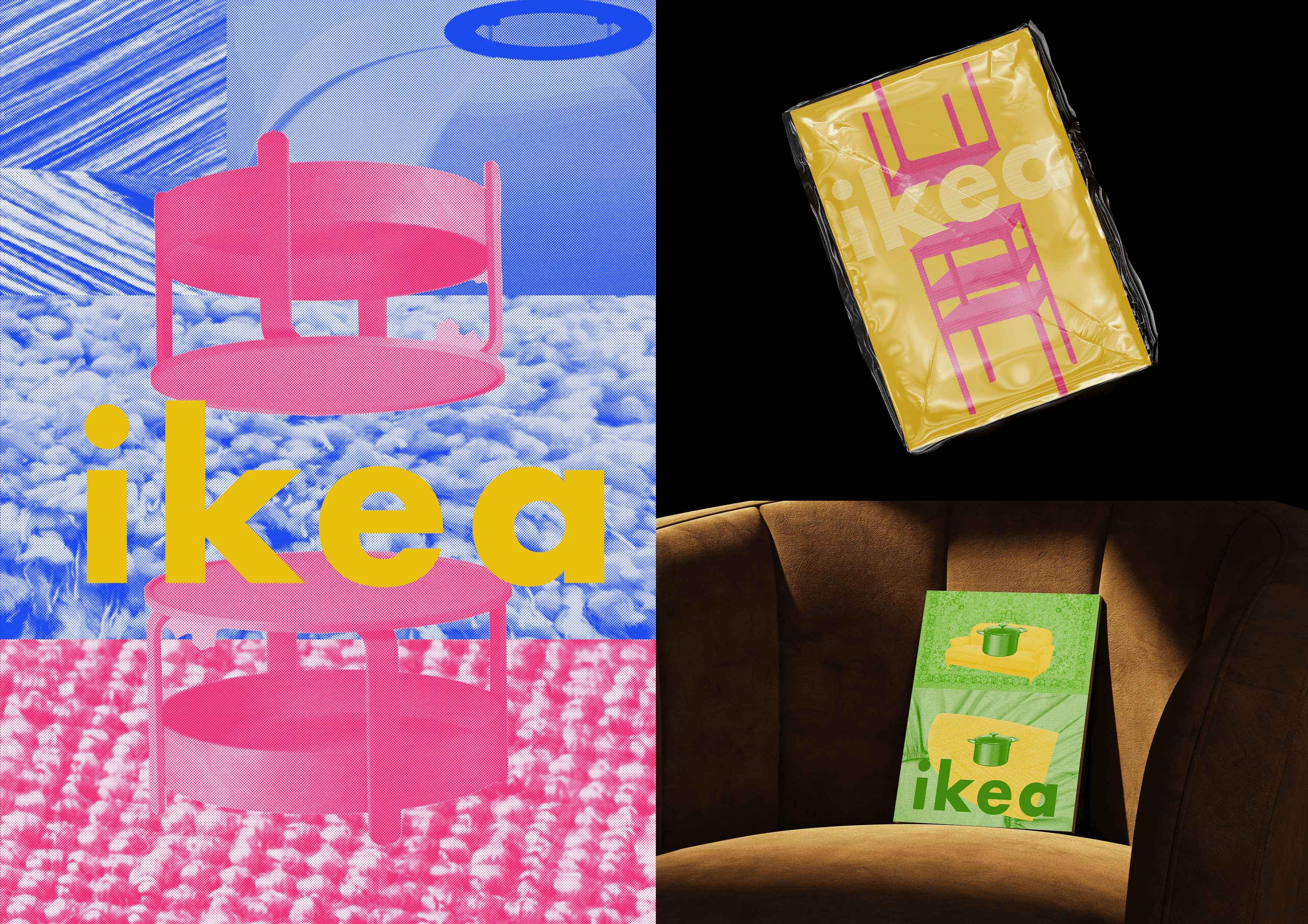 A fresh palette of pinks, blues, and yellows injects youth and energy, while subtle brand cues like a rotated small-caps IKEA logo maintain familiarity. This conceptual rebrand reimagines IKEA through a bold, layered visual language, emphasizing texture, colour, and form. Techniques like forced integration, and halftone effects turn functional products into expressive, tactile compositions.Inspired by IKEA’s modularity and materiality, elements like stacked chairs and textured surfaces convey comfort, adaptability, and innovation. The result is a design-forward, emotionally resonant system that invites users to see IKEA not just as furniture, but as tools for creative living.