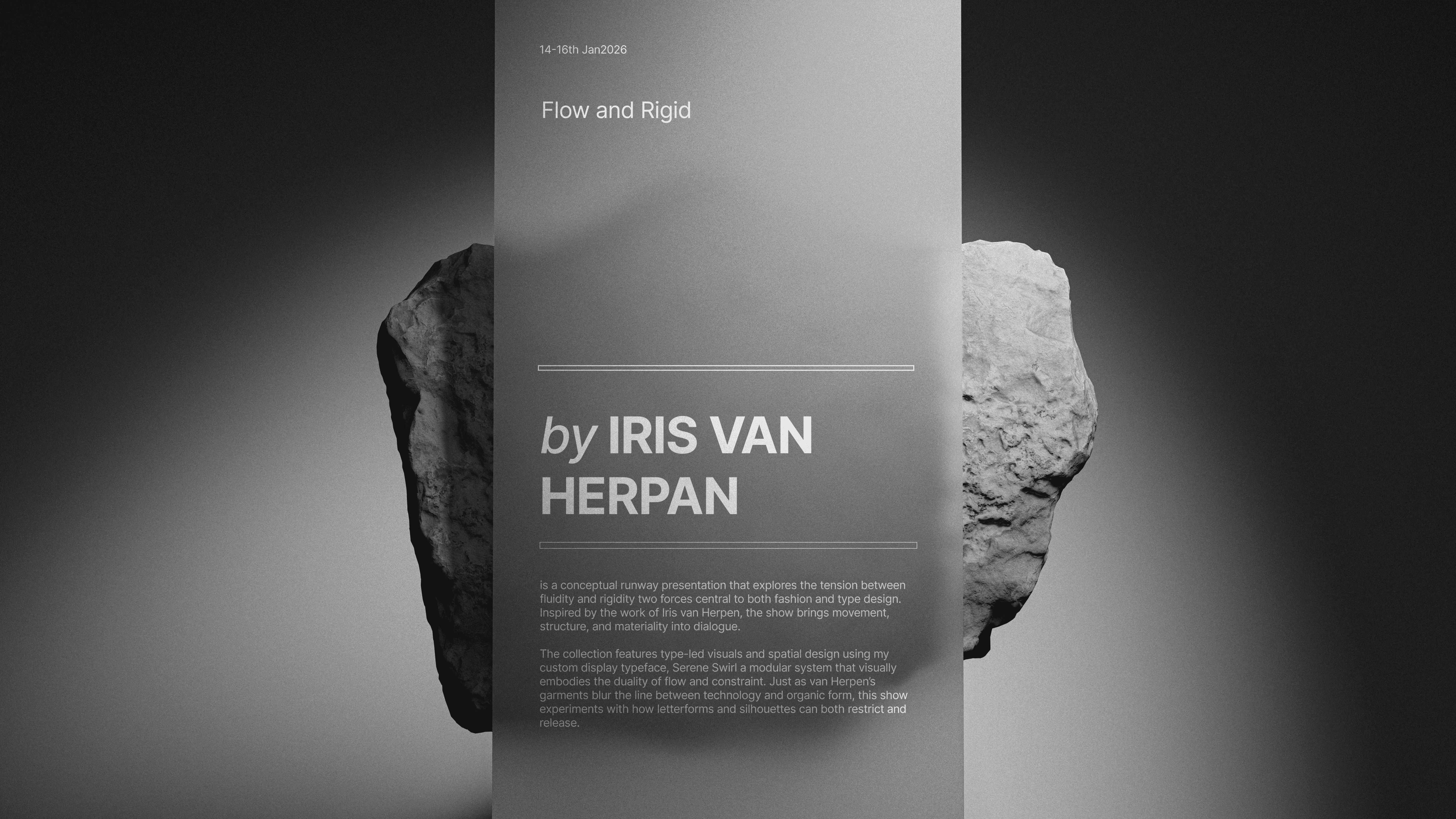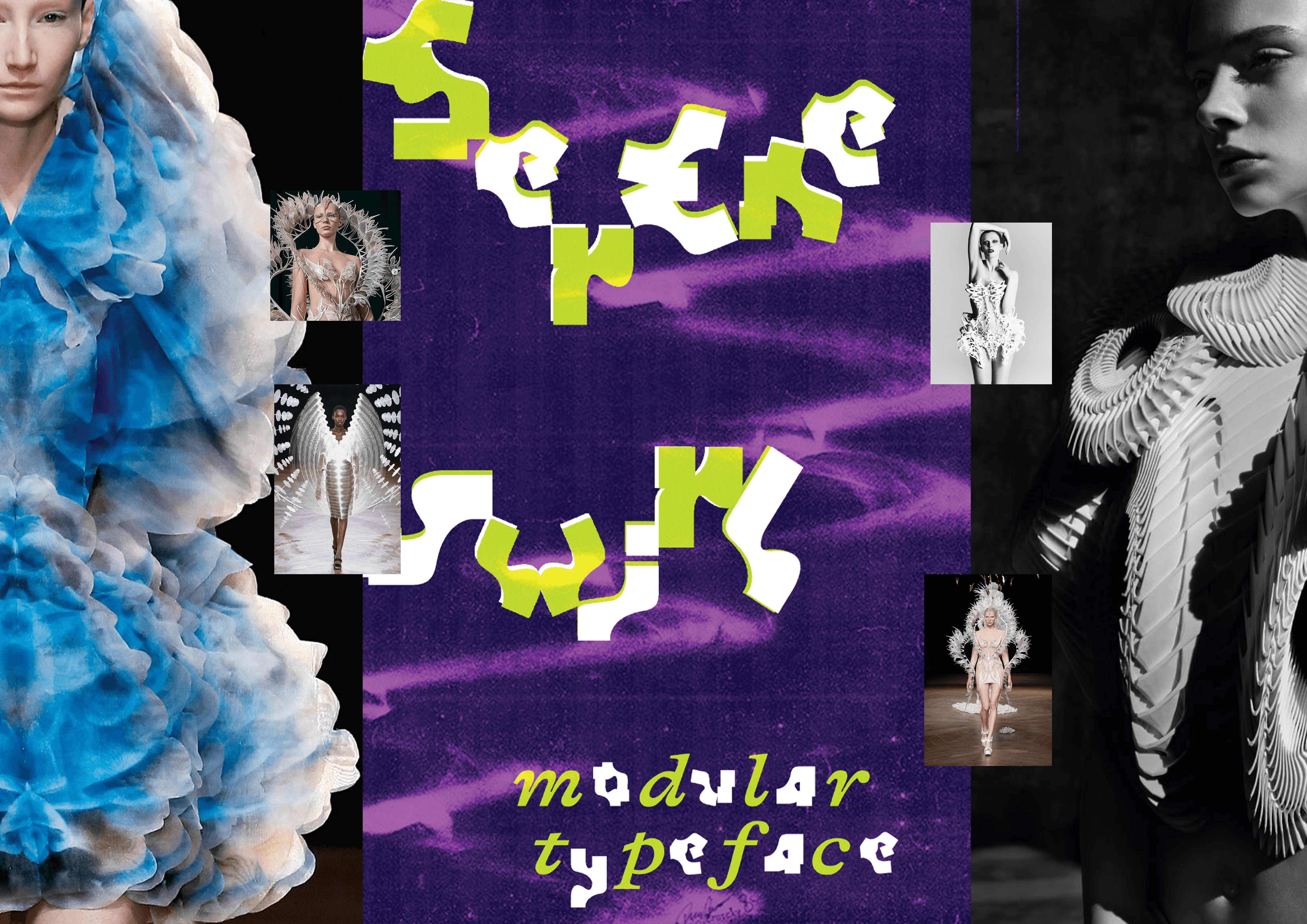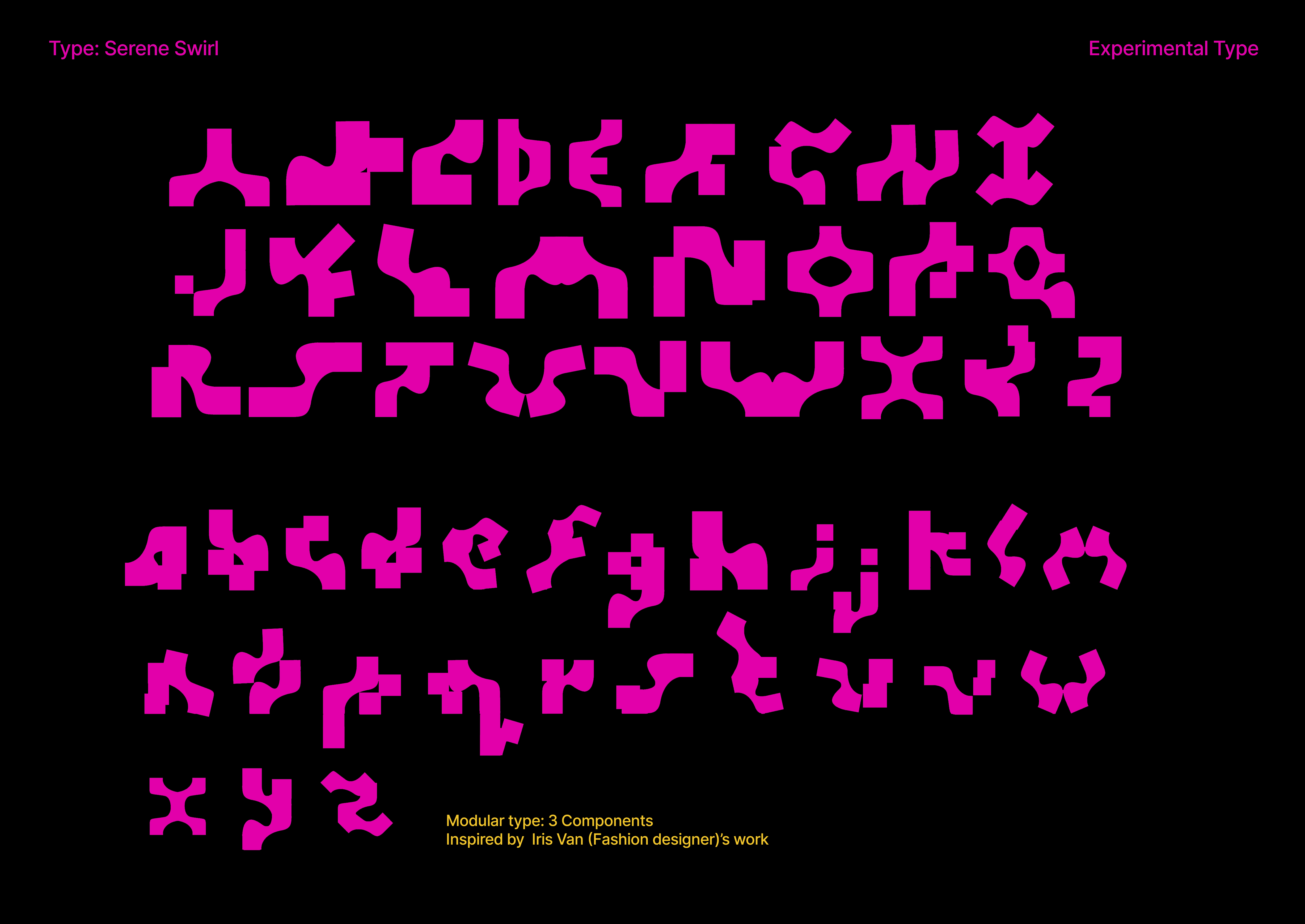 "Serene Swirl" is an experimental typeface inspired by Iris van Herpen’s fusion of fluidity and structure. Drawing from her signature blend of fluidity and structure, I designed three modular components: rigid squares connected by flowing, curved lines. The result is a typeface that visually balances tension and grace, echoing van Herpen’s fusion of movement and geometry. Each letter captures the surreal, transformative spirit of her designs, creating a striking interplay between confinement and freedom.