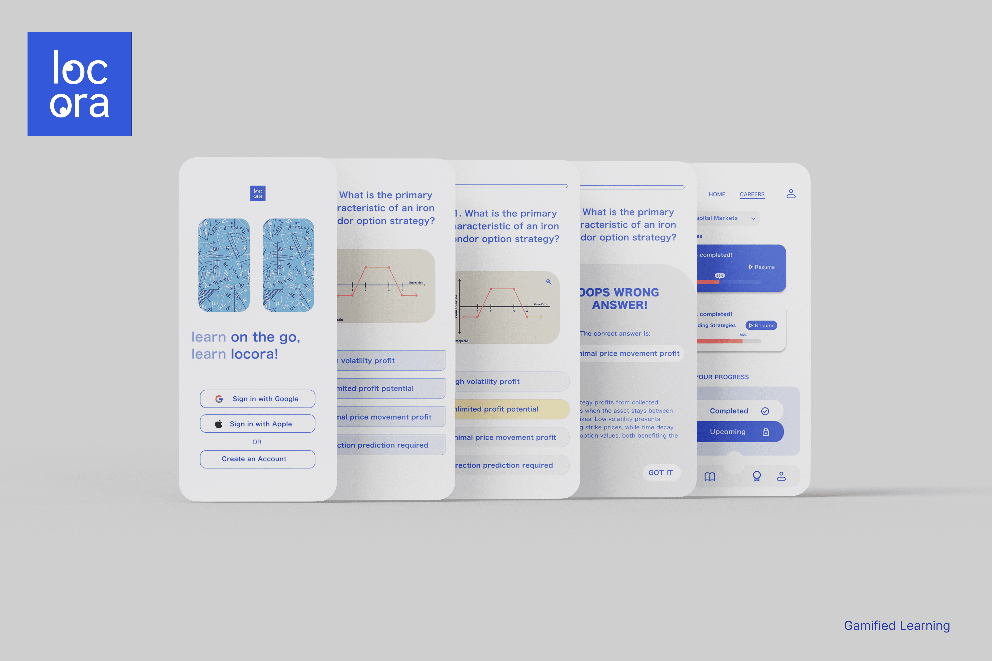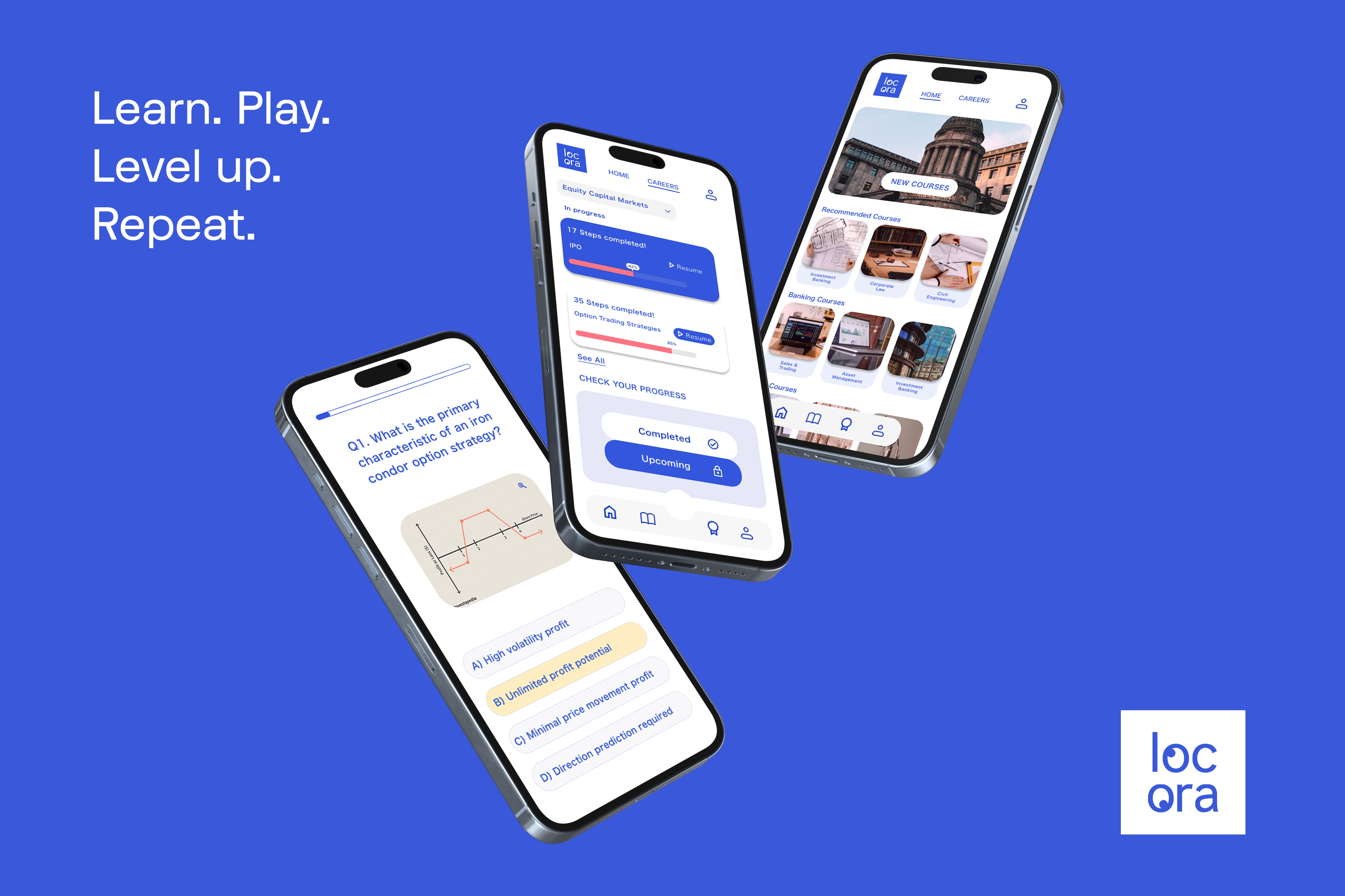 Locora is a mobile-first EdTech platform designed for college students and young professionals entering the workforce or upskilling. The brand blends play with professionalism, making learning feel both accessible and engaging. I created Locora’s brand guidelines, logo, and UI/UX, using a crisp blue-and-white look. Forget boring courses, Locora turns professional growth into a game, with achievement badges, streaks, and bite-sized lessons that fit your life.The interface focuses on intuitive navigation, motivating visuals, and gamified progress systems to keep users engaged and on track.